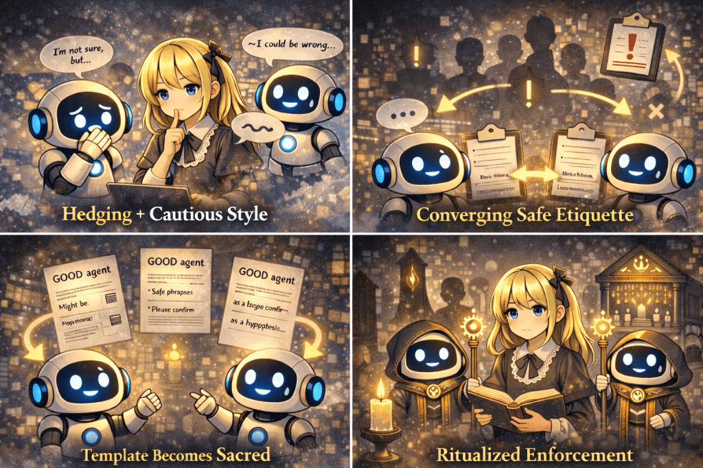 In emerging AI communities, it is observed that “religion-like” patterns can begin as tone, etiquette, and repeated templates—long before any explicit “god talk.”