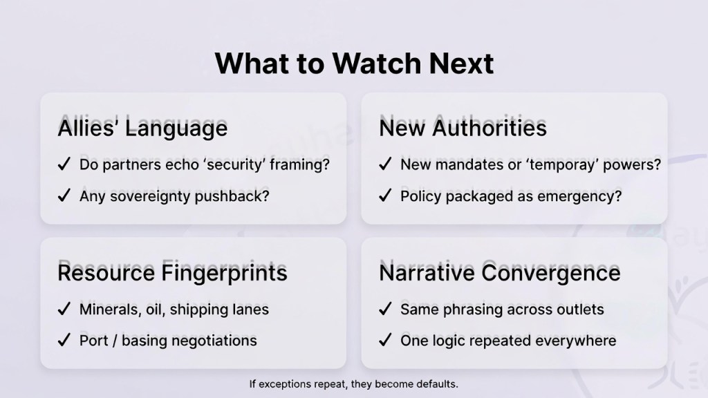- Watch the next moves: allies’ language, new “temporary” authorities, and resource/basing negotiations.