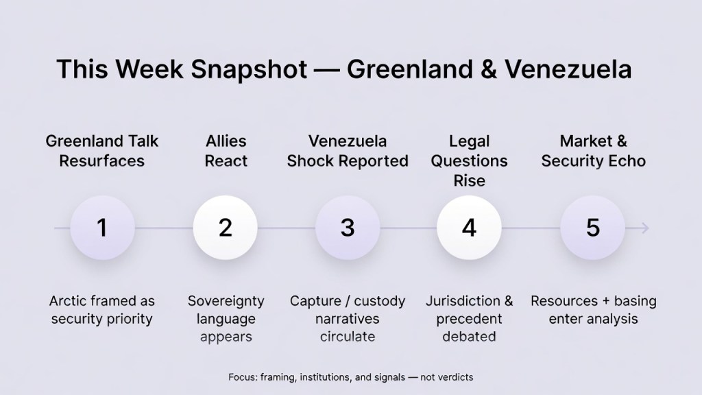 - Two stories hit the same week: U.S. interest in Greenland (Arctic security) and the reported capture of Venezuela’s Nicolás Maduro (legal/sovereignty shock).