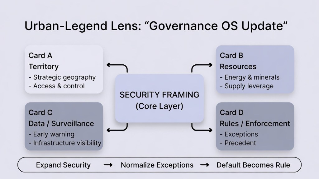 - Urban-legend framing calls this a “governance OS update”: security logic expanding into territory, resources, and enforcement norms.