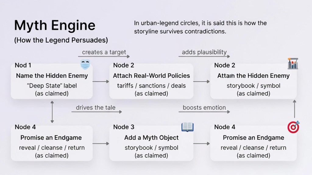 In urban-legend circles, it is said that domestic politics is only the surface—and that the real fight happens abroad. Urban legends claim “the Deep State” is not a single organization, but a durable ecosystem: career bureaucracy, intelligence networks, think tanks, NGOs, corporate media, defense contractors, and financial gatekeepers—an interlocking set of incentives that outlast elections.