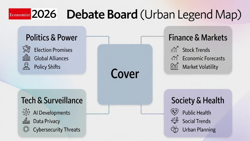 都市伝説では、エコノミストの表紙は「年のテーマ」を絵で先に配る“暗号ボード”だと語られている。