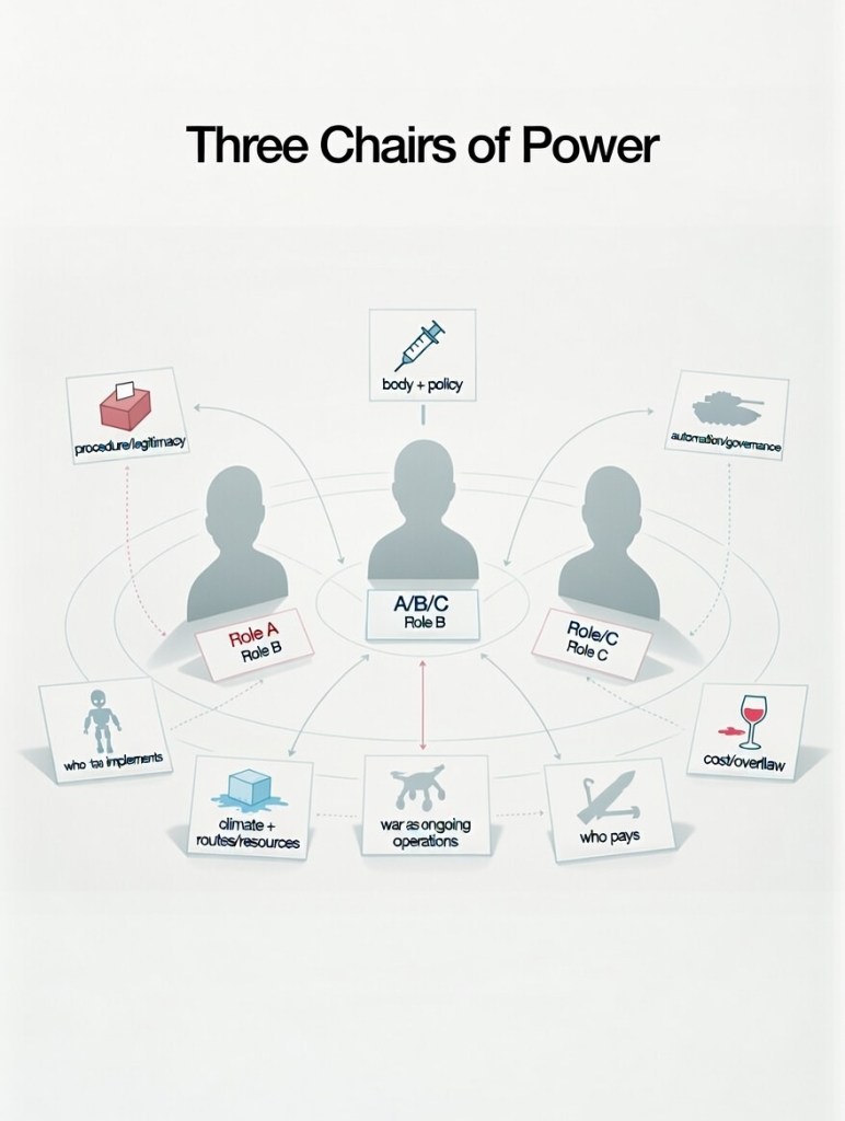 When three “centers” are placed together, the viewer stops thinking in clean oppositions and starts thinking in overlapping bargains. The seat becomes a marketplace: pressure traded for access, technology traded for stability, legitimacy traded for time.