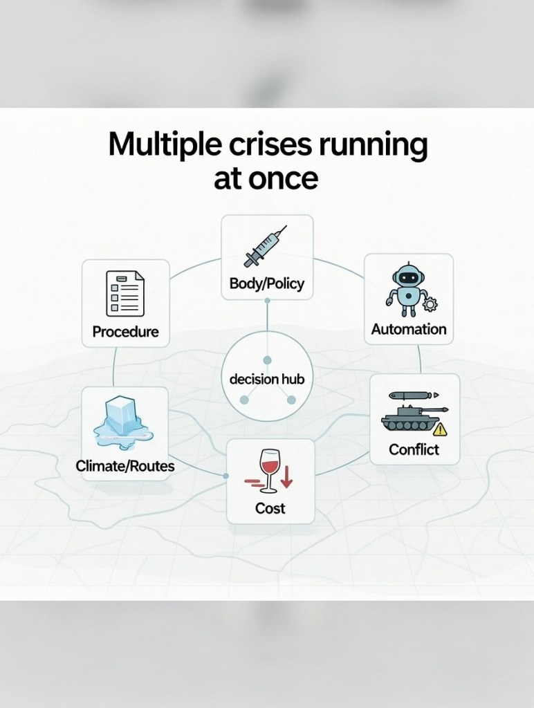 - Surrounding symbols (vote, syringe, robot, missiles, melting ice, red spill) stack into a single “compound-crisis board.”