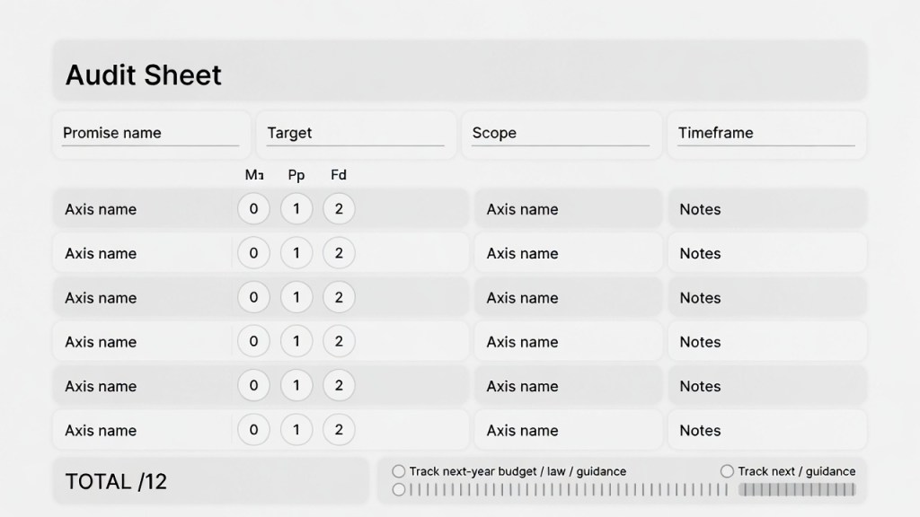 To compare promises fairly, score each axis from 0 to 2 and total up to 12 points.