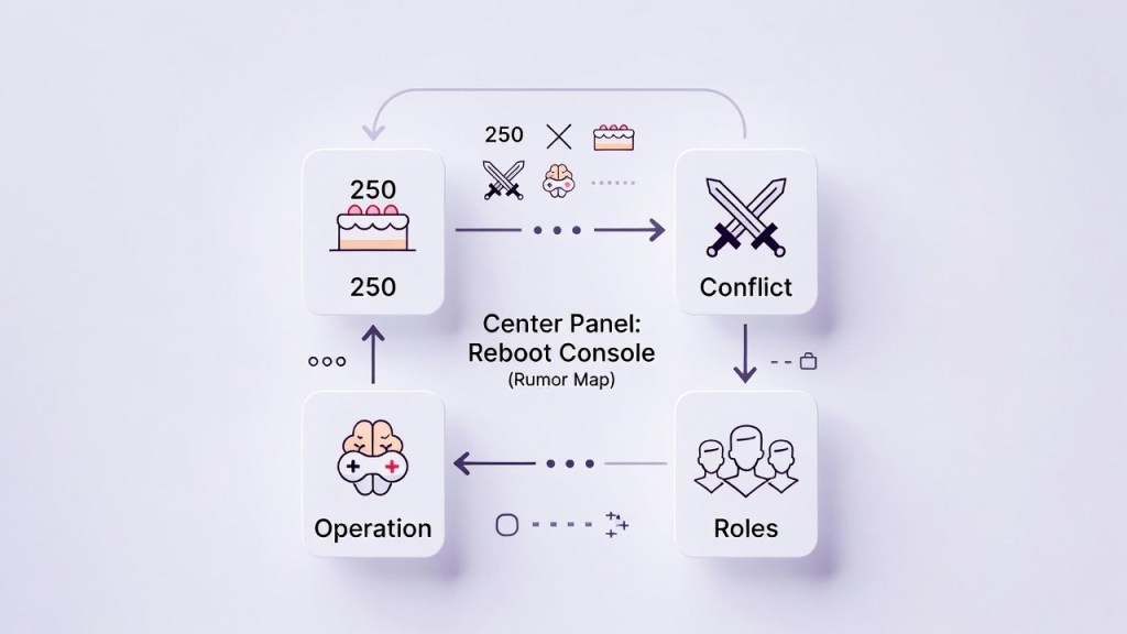 - The center panel looks like a “reboot console”: celebration (250) + conflict (crossed swords) + control (brain–controller) bundled into one system.